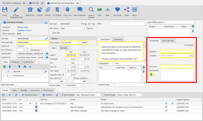 If you have a relationship with Broadbean and have a user name and password entered into the system you will be able to see the Broadbean icons on the Job record.