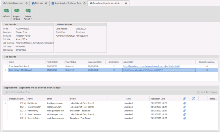 To view the results, use you My infinity Broadbean results or via the Broadbean Results button within the job record: