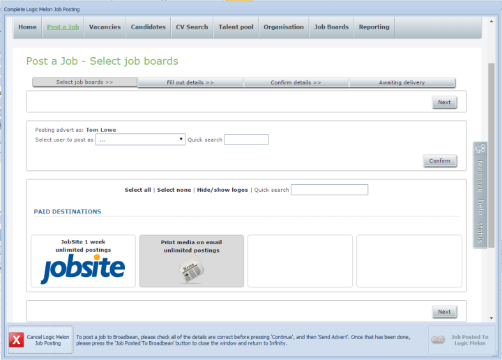 - The LogicMelon dialogue box will open where you can review the job boards and the user you are posting the job as: