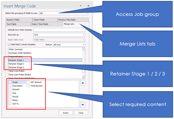 Job Retainer content can be used to populate email and / or email attachment (post) templates (Terms or Invoicing) using merge codes: