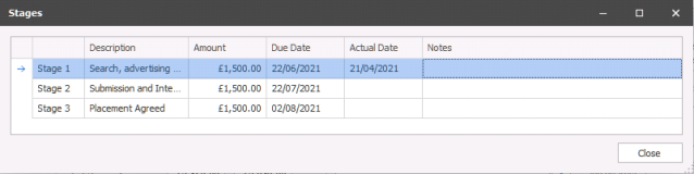 Enable Retainer against the job by ticking the job retainer box, you can then open the Stages dialogue box: