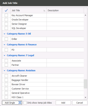 Alternatively you can use the Add Multiple button to tick appropriate job title(s) for that candidate. The list will be grouped by category for quick access to appropriate job titles.