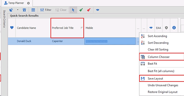 The candidate’s ‘preferred job title’ is available in the column chooser and can be added to the Temp Planner candidate results grid