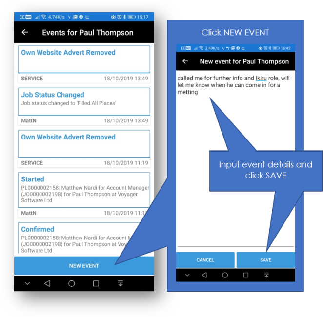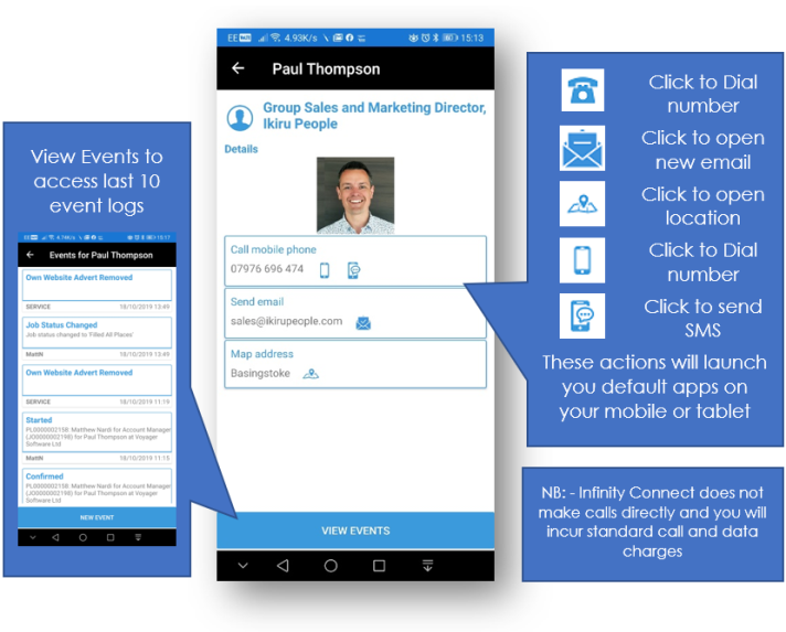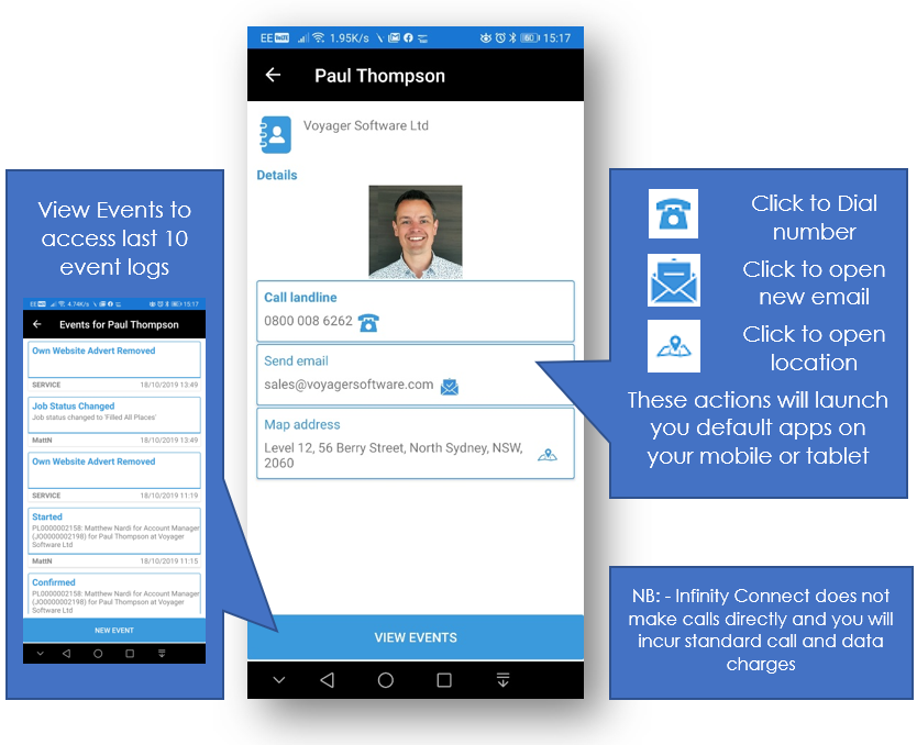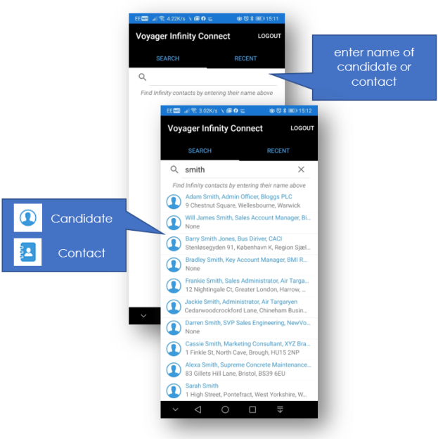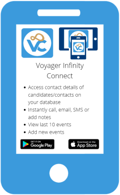 The mobile phone application is available for our SaaS users, the application accesses Infinity's candidates and contacts details and can be used to log events, make calls, email, SMS and look up their location. The application will request your password if you are inactive for more than 30 minutes but will remember your username and Voyager Instance Code.