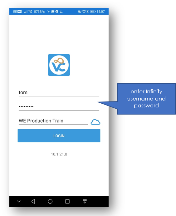Launch the App and enter your Voyager Instance Code, username and password for Infinity, the username and Voyager Instance Code will be remembered after logging in but the password will need to bere-entered each time you access the application.