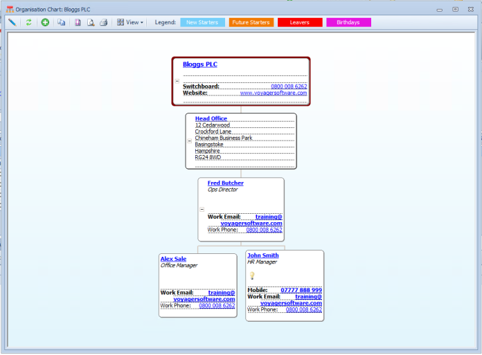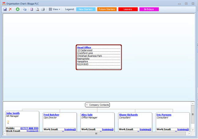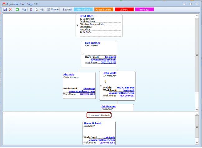 The organisational chart enables you to show in a chart format those people that are contacts within an organisation.
