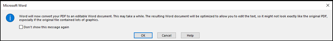 Alternatively you can right click on a PDF stored outside of Infinity and Open With Word, when the dialogue box appears tick "Don't show this message again".