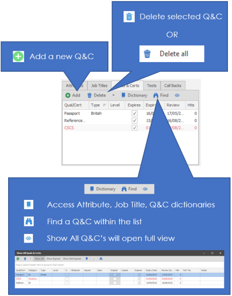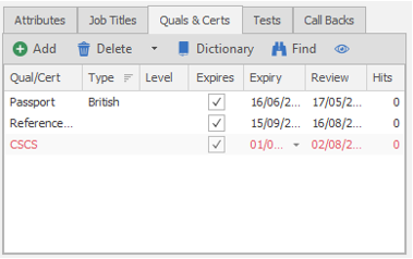 Quals & Certs can be put against candidates, contacts, companies or locations. These allow you to record expiry dates against the qualification or certificate and generate a reminder to users or via the application menu, to ensure compliance. The reminder timeframe is setup by the system administrator, so they can dictate how many days prior the reminder is set to.