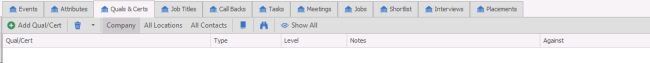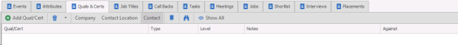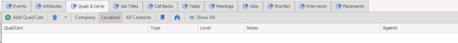 To add Quals & Certs to a contact, company or company location you go to the appropriate company record and click on the location or contact as appropriate, you will see the appropriate tab labels available, see screenshots below: