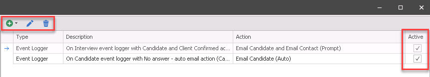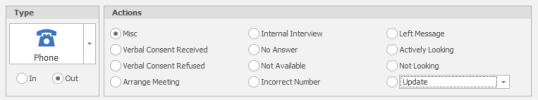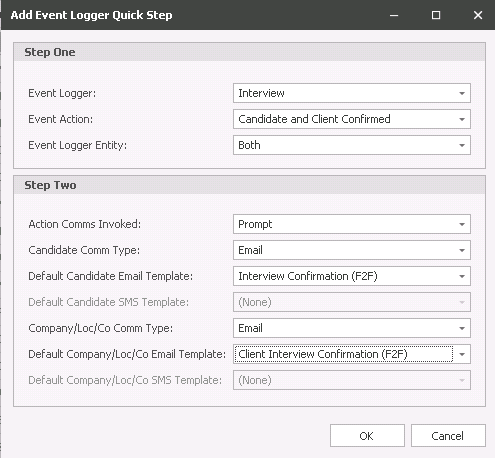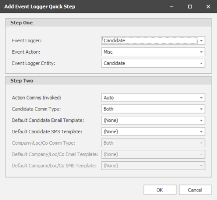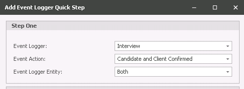 - Event Logger Entity - when an event logger action is selected the entity type can be selected. This corresponds to the radio button that is used in the Event Logger screen - candidate / contact / both