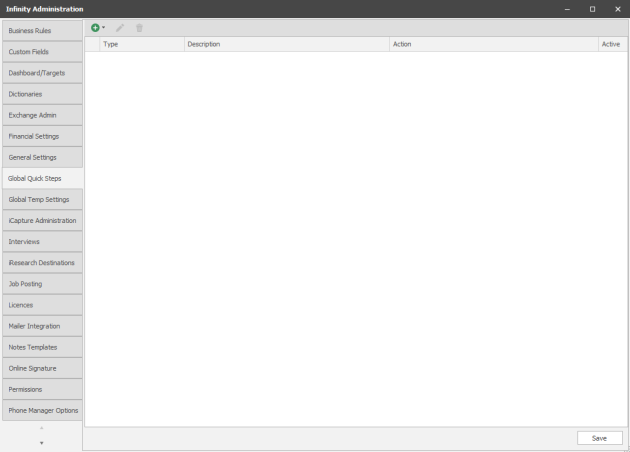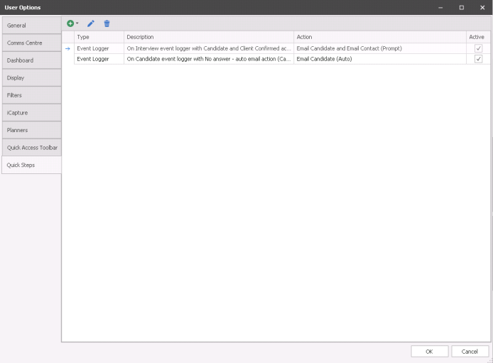 Quick Steps feature allows you to automate processes within Infinity, using an action that you complete as a "trigger" to then complete an automated action. For example, you log a specific type of call in a candidate record, like left message, this is the trigger, and it can then send out an email automatically saying sorry I missed you.