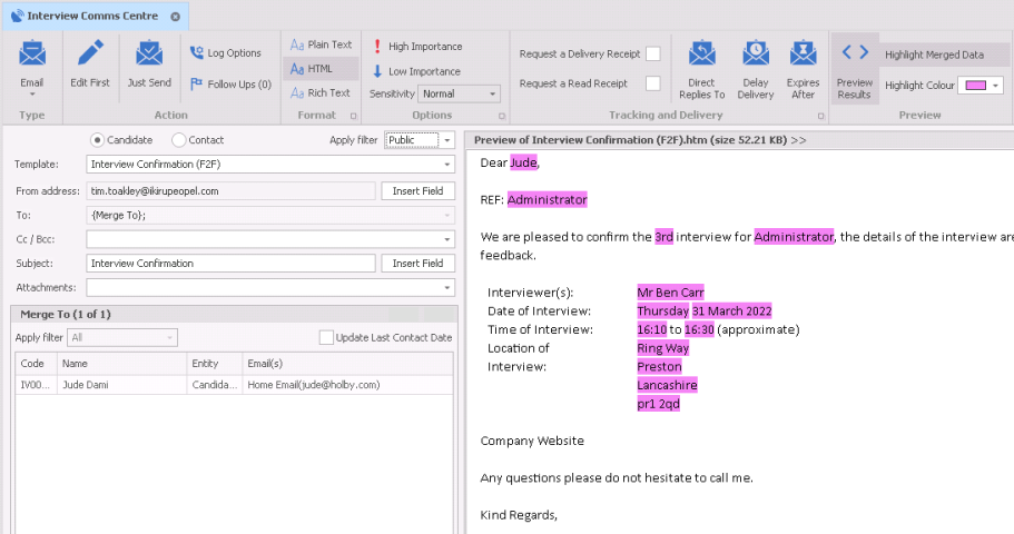 When ‘Action Comms’ are set to ‘Comms Centre’ the standard Comms Centre screen is displayed with the set default template and entity, ready for the user to edit / send (cannot be used when sending to both candidate and contact at the same time)