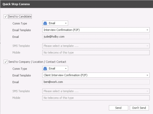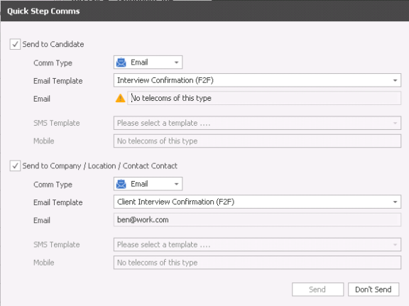 This is a cut down version of the Comms Centre that allows both a candidate and contact, SMS and Email to be sent at the same time. Only the comm type and template can be changed by the user