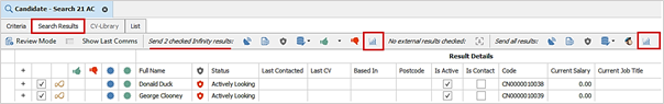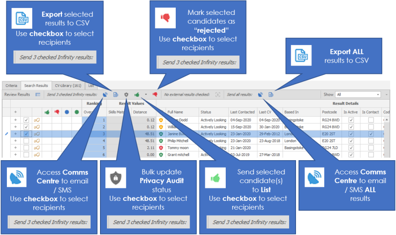 You are able to access the Candidate Comm's Centre from your results, once you have checked the appropriate candidates you can then selectively send an email or SMS to those you have checked,if you would like to send to all results then use alternate Comms Centre button further to the right. See the Comm's Centre section for more details on sending emails