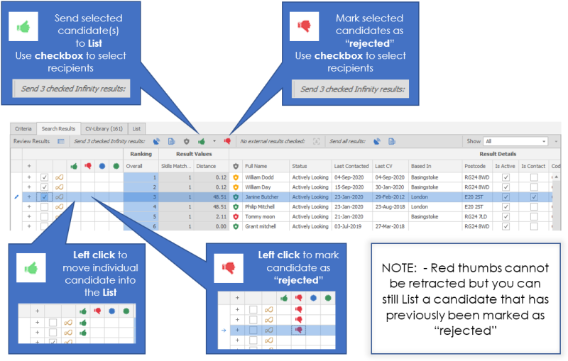 Results is designed for Large mailshots where you don’t want a list to be stored, or sending out a large mailshot to candidates about a job, the event is logged against the candidate record but will not be stored within the search results grid