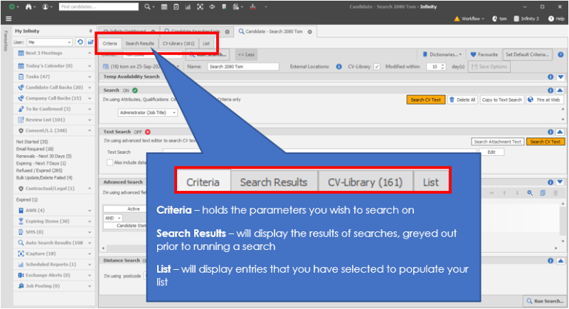 The criteria will allow you to review results and then build lists (or shortlists if searching in jobs).