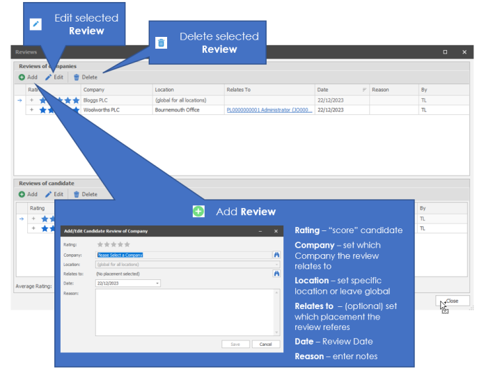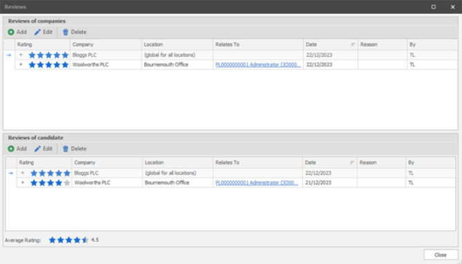Reviews have 2 types, Companies and Candidate. Enabling you to record feedback from the client and from the candidate. These can reference a particular placement and also includes the facility to record multiple reviews as required.