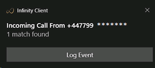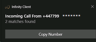 When receiving calls you will receive a Windows notification * if the number is recognised (matched) to more than 1 record then it will display the number of matching records it has matched to. The notification will display "copy number" to enable you to look up the number within Infinity: