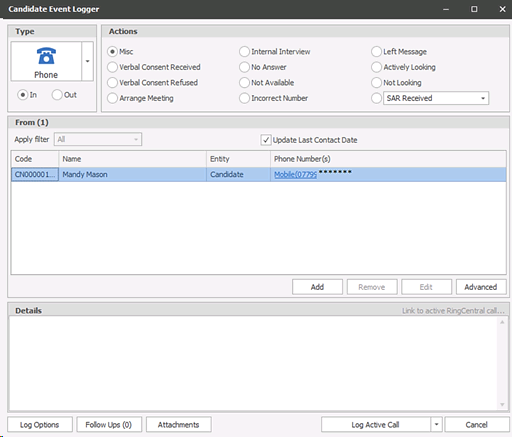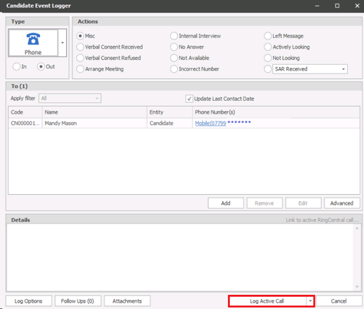 If an active call is found the option greys out and the log button changes to ‘Log Active Call’ as per standard functionality. Once done, the call cannot be un-linked. If the user wishes to un-link the call then they need to cancel out of the event logger and log the event again