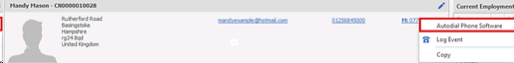 An outgoing phone call is launched from Infinity by left clicking on a telephone hyperlink or right clicking and choosing the ‘Autodial Phone Software’ menu option. This is available in Basic Details on candidate, company, location and contact pages