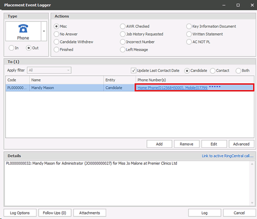 The user can also left click on a telephone hyperlink in the ‘Phone Number(s)’ column inside phone event loggers e.g. placement, call backs etc...