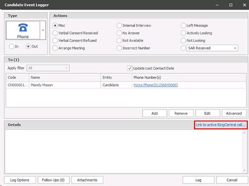 If an incoming / outgoing RingCentral call is in progress and not currently linked to the Infinity event, there is an option in the phone event loggers to ‘Link to active RingCentral call’