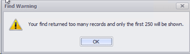 You are limited to 250 records in the find screen, a warning message will appear when too many records have been found: