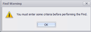 You will be prevented from using the Find screen when there is no criteria entered, if an attempt to find without criteria is made you will receive a SaaS warning message: