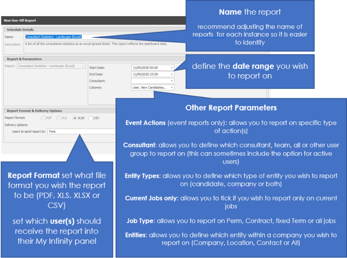 The New Scheduled Report dialogue box in which you will be given the appropriate parameters for the report you selected.