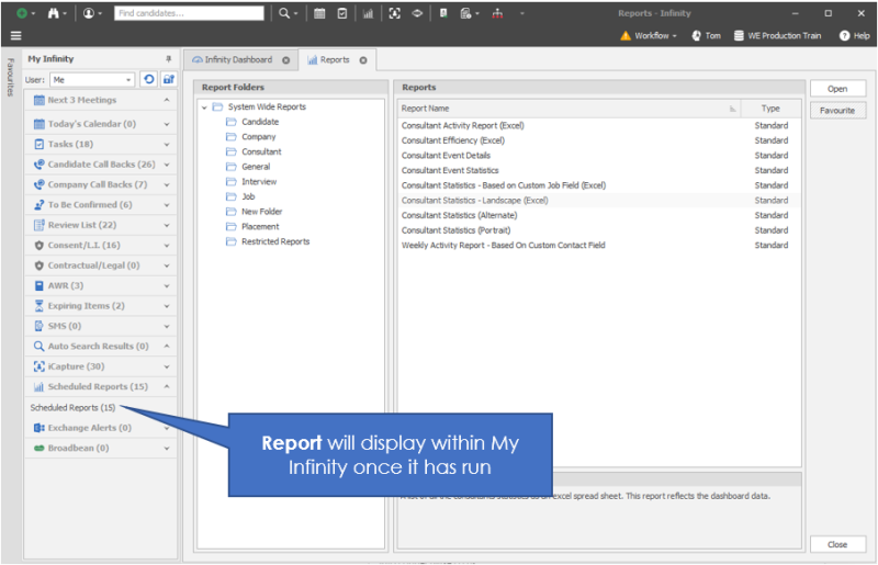 Clicking on the reports button (on the Quick Access Toolbar) will load up the Infinity Reports.