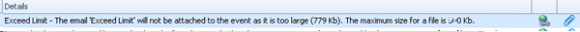 Exchange sync (email / calendar / task item) will log an event stating that the file could not be attached because it was too large: