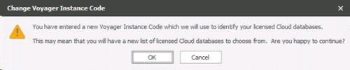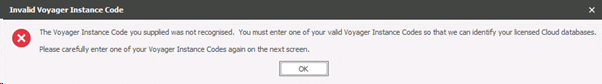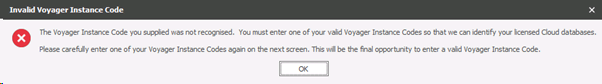- When a user incorrectly enters a Voyager Instance Code for the first time, the following window appears