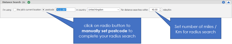 - The distance search is based on a radius search. The search will look in an invisible circle around a postcode that you enter. The search is as the crow flies, and not based on any road systems. For example you may wish to see all the candidates that live within a 10 mile radius of RG24 8WD.