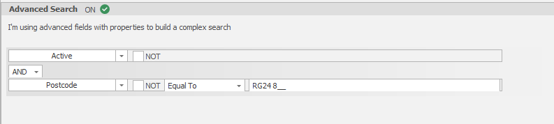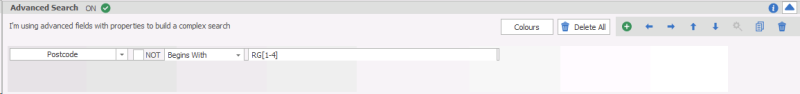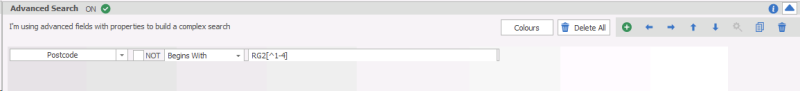 If you wish to not bring up candidates that have a particular post code you can use code as below, this will bring up all candidates with RG20 and onward but not RG21, RG22, RG23 or RG24 as we have used the ^ to tell the system to not include 1 to 4 following the RG2.