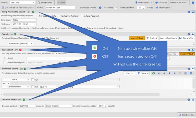 Temp Availability Search is activated within your User Options, searching candidates Temp calendar, this includes any Temp placements and any unavailability entries