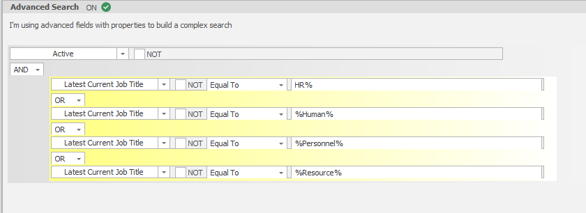 Example below shows using wildcards before and after text for some criteria. HR% will return anyone with the job title that starts with HR, %Human% will return anyone with the job title that has Human anywhere within their job title field.