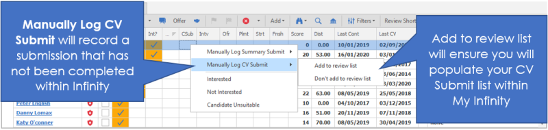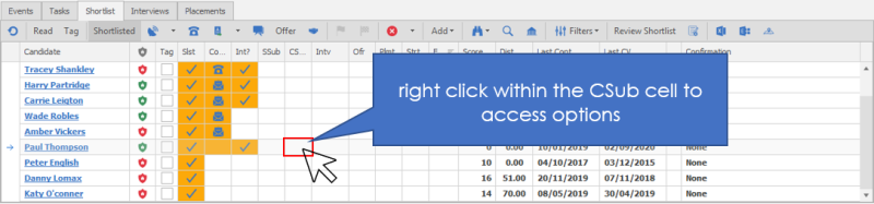 - In a shortlist you can right click on the correct name to manually record that you have submitted a CV (or Summary)