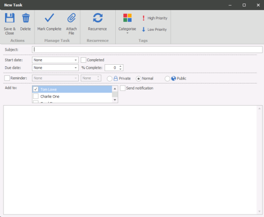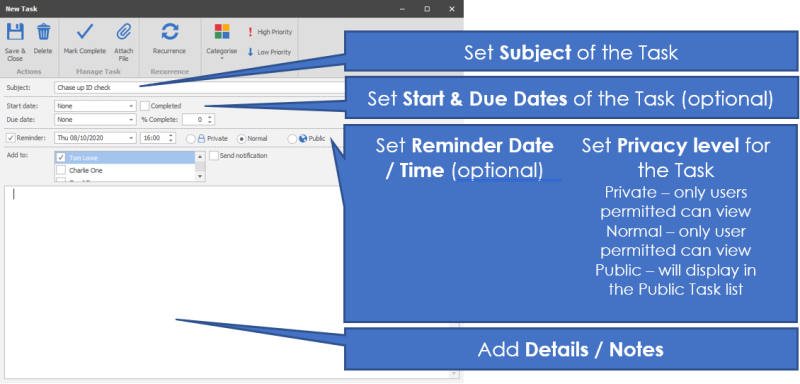 Private – For your eyes only Normal – Appears in your diary but can be viewed by others Public – Appears in everyone’s Tasks |