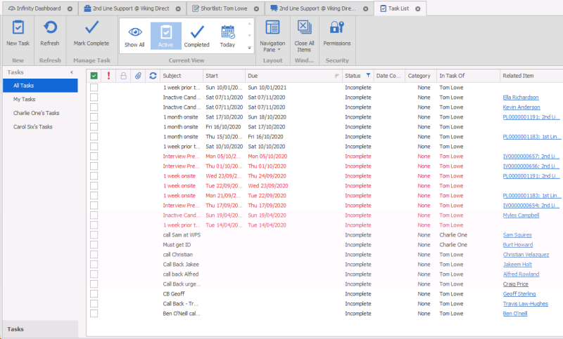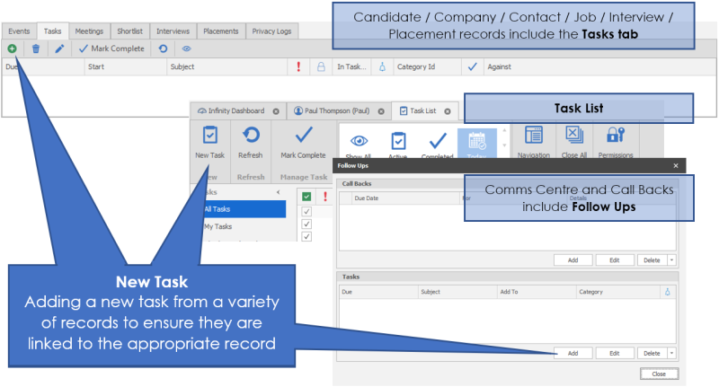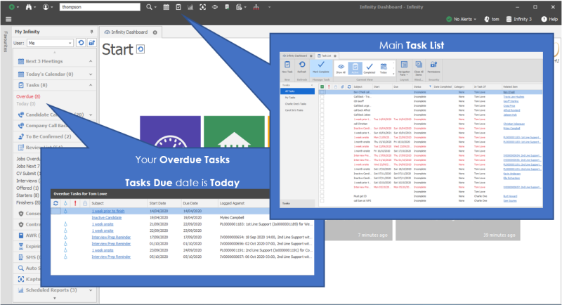 Tasks can be generated by a business rule or template follow up. These will have been created by the system administrator to ensure key actions are completed by users. For example, to have a task created to follow up after a week of a candidate starting a placement.