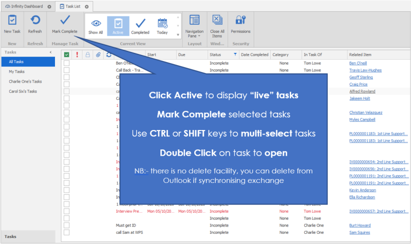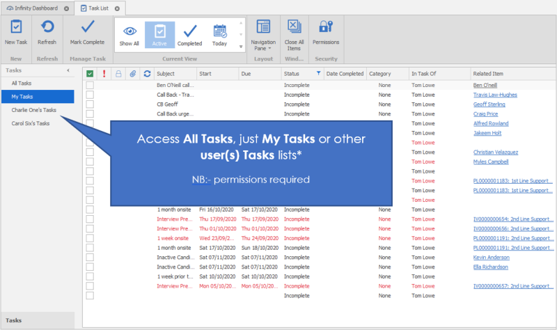 Will show you all of the tasks and management options. When you first open the task list you will see All Tasks, if you prefer to look at just your tasks you can select My Tasks from the left hand panel. When you first go into tasks it will show you a consolidated view of everyone’s tasks however your own task list and other user task lists are available in the left hand panel when they have given you the appropriate permission.