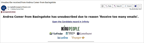 Note – email notifications are also sent when Infinity receives an unsubscribe request from the Mailchimp integration (candidate and contact list only).