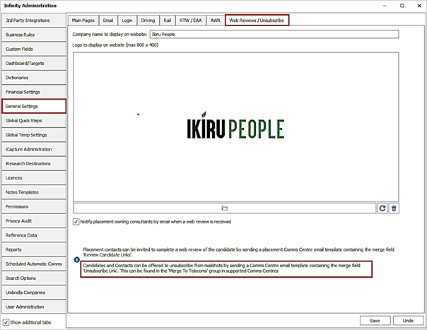 Emails can be sent from the Infinity Comms Centre to candidates /contacts, offering an unsubscribe link. The recipient can click the link and unsubscribe on a website. This will update Infinity and untick the ‘OK to Mailshot’ field against the candidate’s / contact’s email address.