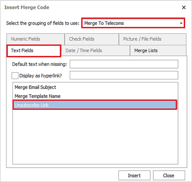 Comms Centre template setup - There is a new merge field called ‘Unsubscribe Link’ in the ‘Merge To Telecoms’ group / ‘Text Fields’ tab in candidate / contact related Email Comms Centres.