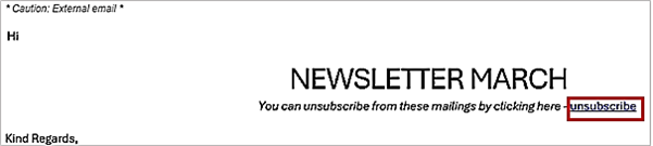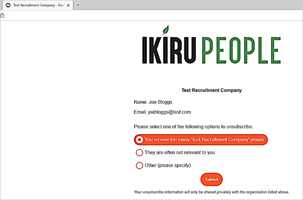 On the website, the recipient can select the required radio button and click unsubscribe or cancel out by closing the browser tab. If ‘Other’ is selected, then comments are mandatory.